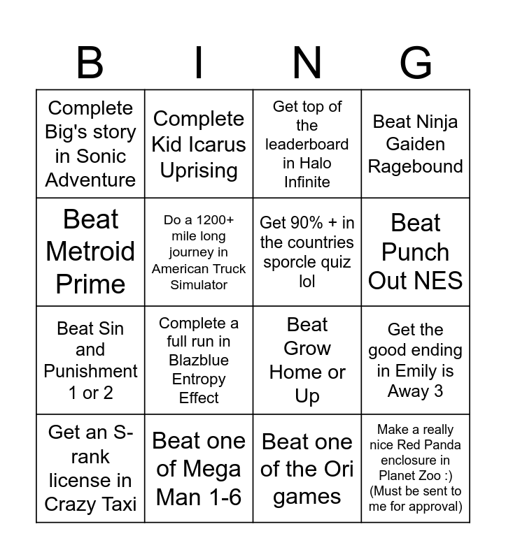 This bingo card has 16 words: Beat one of Mega Man 1-6, Get the good ending in Emily is Away 3, Get top of the leaderboard in Halo Infinite, Complete Big's story in Sonic Adventure, Beat Sin and Punishment 1 or 2, Complete Kid Icarus Uprising, Beat Grow Home or Up, Beat one of the Ori games, Beat Metroid Prime, Do a 1200+ mile long journey in American Truck Simulator, Get an S-rank license in Crazy Taxi, Beat Ninja Gaiden Ragebound, Complete a full run in Blazblue Entropy Effect, Beat Punch Out NES, Get 90% + in the countries sporcle quiz lol and Make a really nice Red Panda enclosure in Planet Zoo :) (Must be sent to me for approval).