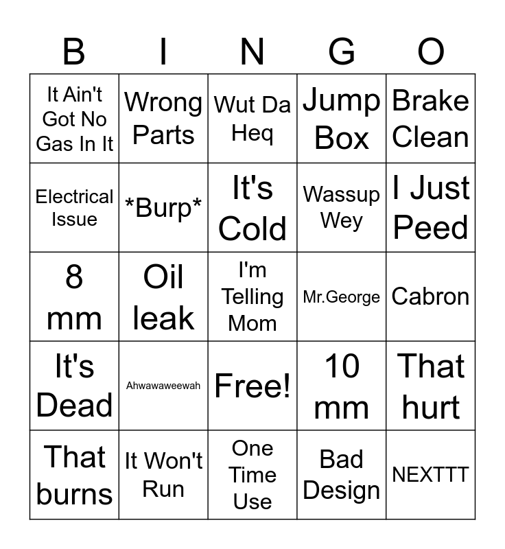 This bingo card has 26 words: Free!, Bad Design, It's Cold, It Won't Run, Brake Clean, It Ain't Got No Gas In It, Electrical Issue, Wrong Parts, Cabron, 10 mm, Wassup Wey, 8 mm, That hurt, That burns, Oil leak, Oh Heck Nah, Jump Box, It's Dead, Wut Da Heq, I'm Telling Mom, I Just Peed, One Time Use, Mr.George, Ahwawaweewah, *Burp* and NEXTTT.