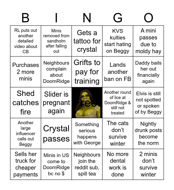 This bingo card has a free space and 24 words: Crystal passes, Minis in US come to DoomRidge bc no $, Grifts to pay for training, Sells her truck for cheaper payments, A mini passes due to moldy hay, RL puts out another detailed video about CB, Purchases 2 more minis, Minis removed from sandholm after falling out, Another round of lice at DoomRidge & still not treated, Something serious happens with George, Lands another ban on FB, Shed catches fire, The cats don’t survive winter, Nightly drunk posts become the norm, Neighbours complain about DoomRidge, No more dental work is done, Elvis is still not spotted or spoken of by Beggy, Gets a tattoo for crystal, Daddy bails her out financially again, Slider is pregnant again, 2 minis don’t survive winter, Another large influencer calls out Beggy, KVS kulties start hating on Beggy and Neighbours join the reddit sub, spill tea.