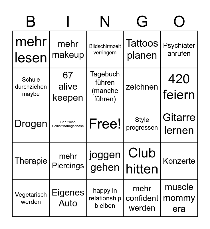 This bingo card has a free space and 24 words: mehr Piercings, Eigenes Auto, Tagebuch führen (manche führen), Vegetarisch werden, Psychiater anrufen, mehr lesen, Schule durchziehen maybe, mehr makeup, Style progressen, joggen gehen, zeichnen, Drogen, Club hitten, Konzerte, 67 alive keepen, mehr confident werden, Gitarre lernen, Bildschirmzeit verringern, 420 feiern, Berufliche Selbstfindungsphase, muscle mommy era, Therapie, Tattoos planen and happy in relationship bleiben.