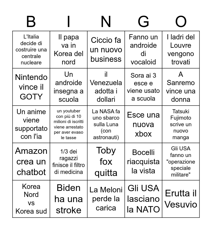 This bingo card has a free space and 24 words: 1/3 dei ragazzi finisce il filtro di medicina, Biden ha una stroke, il Venezuela adotta i dollari, Korea Nord vs Korea sud, I ladri del Louvre vengono trovati, L'Italia decide di costruire una centrale nucleare, Nintendo vince il GOTY, Il papa va in Korea del nord, Esce una nuova xbox, Toby fox quitta, Sora ai 3 esce e viene usato a scuola, Un anime viene supportato con l'ia, Bocelli riacquista la vista, Gli USA fanno un "operazione speciale militare", Un androide insegna a scuola, Gli USA lasciano la NATO, Tatsuki Fujimoto scrive un nuovo manga, Ciccio fa un nuovo business, A Sanremo vince una donna, un youtuber con più di 10 milioni di iscritti viene arrestato per aver evaso le tasse, Erutta il Vesuvio, Amazon crea un chatbot, Fanno un androide di vocaloid and La Meloni perde la carica.