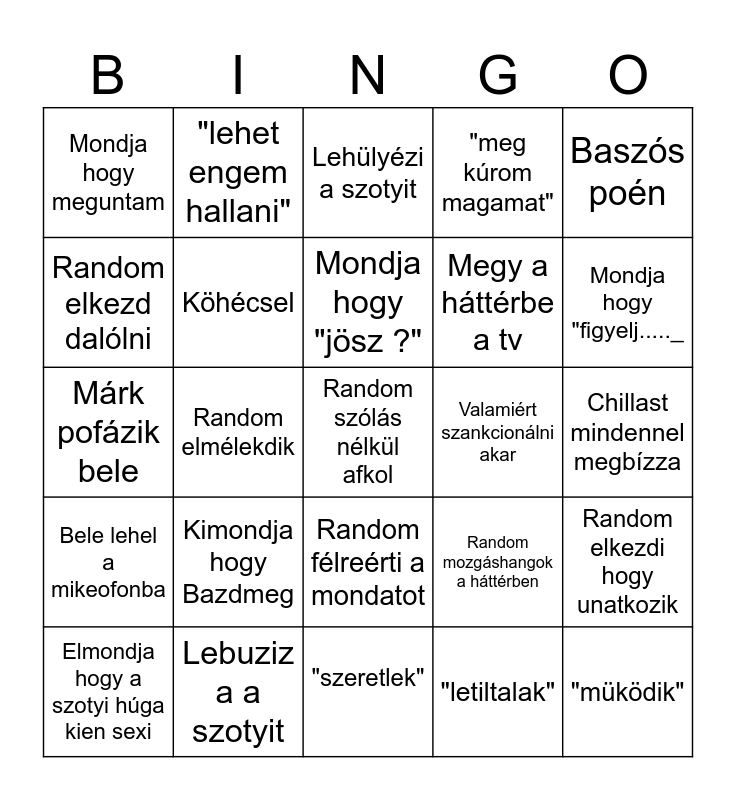 This bingo card has a free space and 24 words: Kimondja hogy Bazdmeg, Lebuziz a a szotyit, Mondja hogy "jösz ?", Elmondja hogy a szotyi húga kien sexi, Baszós poén, Mondja hogy meguntam, Random elkezd dalólni, "lehet engem hallani", Valamiért szankcionálni akar, Random félreérti a mondatot, Megy a háttérbe a tv, Márk pofázik bele, Random mozgáshangok a háttérben, Random elkezdi hogy unatkozik, Köhécsel, "letiltalak", Chillast mindennel megbízza, Lehülyézi a szotyit, Mondja hogy "figyelj....._, Random elmélekdik, "müködik", Bele lehel a mikeofonba, "meg kúrom magamat" and "szeretlek".