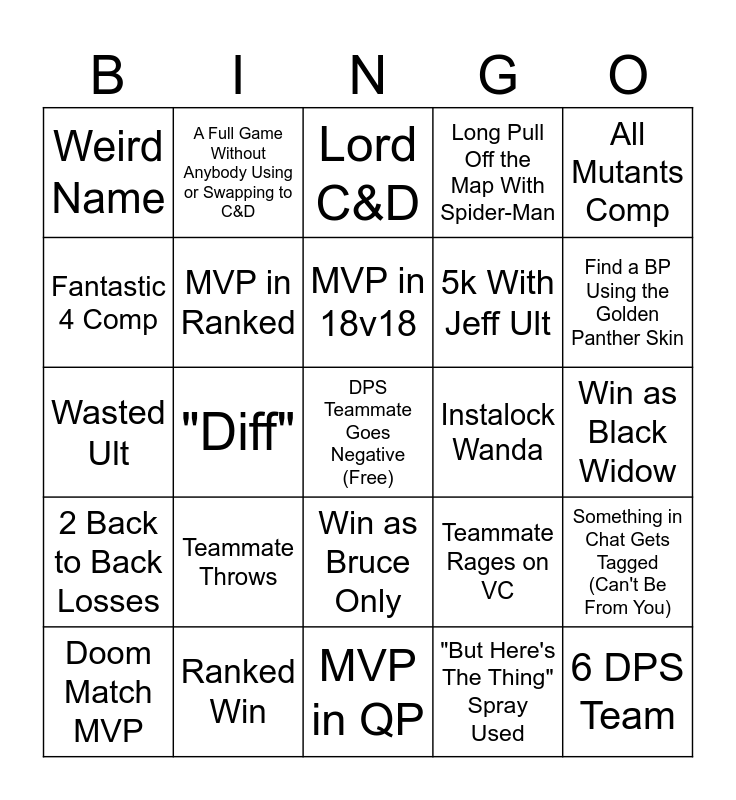 This bingo card has a free space and 24 words: Teammate Throws, Ranked Win, MVP in 18v18, Doom Match MVP, All Mutants Comp, Weird Name, Fantastic 4 Comp, A Full Game Without Anybody Using or Swapping to C&D, Instalock Wanda, Win as Bruce Only, 5k With Jeff Ult, Wasted Ult, Teammate Rages on VC, Something in Chat Gets Tagged (Can't Be From You), MVP in Ranked, "But Here's The Thing" Spray Used, Win as Black Widow, Lord C&D, Find a BP Using the Golden Panther Skin, "Diff", 6 DPS Team, 2 Back to Back Losses, Long Pull Off the Map With Spider-Man and MVP in QP.