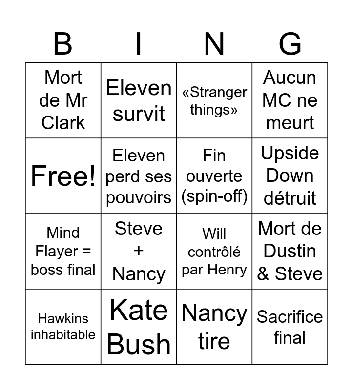 This bingo card has 16 words: Kate Bush, Mort de Dustin & Steve, «Stranger things», Mort de Mr Clark, Mind Flayer = boss final, Eleven survit, Will contrôlé par Henry, Nancy tire, Free!, Eleven perd ses pouvoirs, Hawkins inhabitable, Aucun MC ne meurt, Steve + Nancy, Upside Down détruit, Fin ouverte (spin-off) and Sacrifice final.