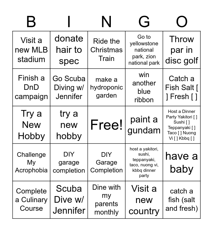This bingo card has a free space and 48 words: "read" 12 books (monthly?), catch a fish (salt and fresh), complete a culinary course, Dine with my parents monthly, DIY garage completion, Do an activity that challenges my Acrophobia, donate hair to spec, finish a crochet project, Finish a DnD campaign, get a new job, Go Scuba Diving w/ Jennifer, Go to yellowstone national park, zion national park, have a baby, host a yakitori, sushi, teppanyaki, taco, nuong vi, kbbq dinner party, lose 20% of my body weight, Make $10k in the stock market, make a hydroponic garden, paint a gundam, Ride the Christmas Train, Throw par in disc golf, try a new hobby, Visit a new country, Visit a new MLB stadium, win another blue ribbon, Read 12 Books, Catch a Fish Salt [ ] Fresh [ ], Complete a Culinary Course, Dine w/ Parents Monthly, DIY Garage Completion, Challenge My Acrophobia, Donate Hair to Spec, Finish a Crochet Project, Complete a DnD Campaign, Get a New Job, Scuba Dive w/ Jennifer, Go to Yellowstone National Park, Have a Baby, Host a Dinner Party Yakitori [ ] Sushi [ ] Teppanyaki [ ] Taco [ ] Nuong Vi [ ] Kbbq [ ], Lose 20% Body Weight, Make $10k in the Stock Market, Build a Hydroponic Garden, Paint a Gundam, Ride the Christmas Train, Throw Par in Disc Golf, Try a New Hobby, Visit a New Country, Visit a New MLB Stadium and Win Another Blue Ribbon.