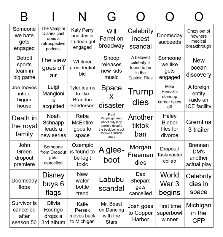 This bingo card has a free space and 48 words: Dax Shepard gets cancelled, Someone we like gets engaged, Mr. Beast on Dancing with the Stars, Noah Schnapp leads a new series, Tyler learns to like Brandon Sanderson, Gremlins 3 trailer, The Vampire Diaries cast does a retrospective podcast, Olivia Rodrigo drops a 3rd album, Doomsday succeeds, A glee-boot, Crazy out of nowhere medical breakthrough, Will Farrel on broadway, Mike Persak's standup career takes off, Trump dies, Doomsday flops, Haley Bieber files for divorce, Detroit sports team in big game, New ocean discovery, World War 3 begins, Celebrity incest scandal, A beloved celebrity is found to be in the Epstein Files, Reba McEntire goes to space, Someone we hate gets engaged, The view goes off air, Celebrity dies in space, Whitmer presidential bid, A foreign entity raids an ICE facility, Survivor is cancelled after season 50, Space X disaster, Luigi Mangioni is acquitted, First time superbowl winner, Another tiktok ban, Brennan DM's another actual play, Disney buys 6 flags, Death in the royal family, Morgan Freeman dies, Dropout/ Taskmaster collab, Joe moves into a bigger house, Ozempic is found to be legit toxic, New water bottle trend, John Green dropout premiere, Michigan in the CFP, Katy Perry and Justin Trudeau get engaged, Katie Persak moves back to Michigan, Snoop releases new kids music, Labubu scandal, Someone from Dropout gets cancelled and Josh goes to Copper Harbor.