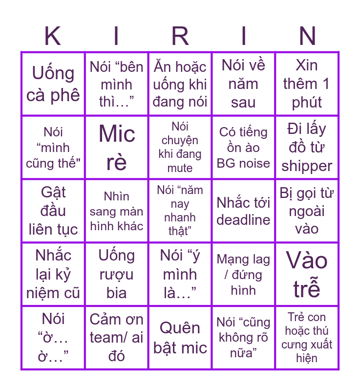 This bingo card has 25 words: Uống rượu bia, Quên bật mic, Nói chuyện khi đang mute, Nói “ờ… ờ…”, Xin thêm 1 phút, Uống cà phê, Nói “mình cũng thế", Nói “bên mình thì…”, Nhắc tới deadline, Nói “ý mình là…”, Có tiếng ồn ào BG noise, Gật đầu liên tục, Mạng lag / đứng hình, Vào trễ, Mic rè, Trẻ con hoặc thú cưng xuất hiện, Bị gọi từ ngoài vào, Ăn hoặc uống khi đang nói, Đi lấy đồ từ shipper, Nhìn sang màn hình khác, Nói “năm nay nhanh thật”, Cảm ơn team/ ai đó, Nhắc lại kỷ niệm cũ, Nói về năm sau and Nói “cũng không rõ nữa”.
