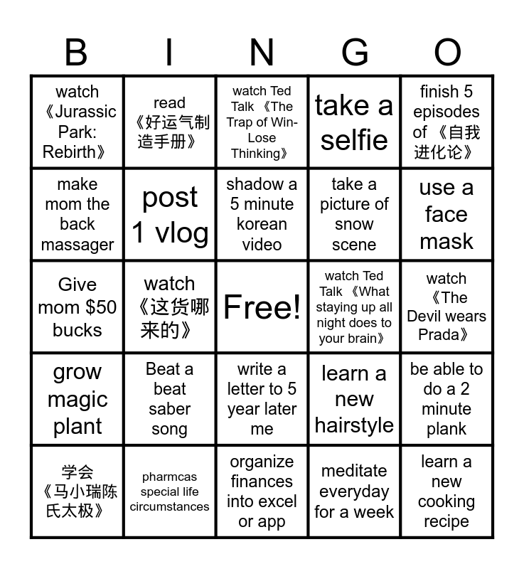 This bingo card has a free space and 24 words: 学会 《马小瑞陈氏太极》, Beat a beat saber song, shadow a 5 minute korean video, meditate everyday for a week, finish 5 episodes of 《自我进化论》, watch 《Jurassic Park: Rebirth》, read 《好运气制造手册》, watch Ted Talk 《The Trap of Win-Lose Thinking》, watch Ted Talk 《What staying up all night does to your brain》, watch 《The Devil wears Prada》, Give mom $50 bucks, post 1 vlog, learn a new hairstyle, be able to do a 2 minute plank, make mom the back massager, pharmcas special life circumstances, organize finances into excel or app, take a selfie, use a face mask, grow magic plant, watch 《这货哪来的》, write a letter to 5 year later me, take a picture of snow scene and learn a new cooking recipe.