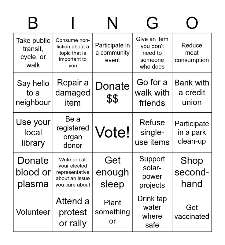 This bingo card has a free space and 24 words: Write or call your elected representative about an issue you care about, Attend a protest or rally, Donate $$, Volunteer, Reduce meat consumption, Take public transit, cycle, or walk, Say hello to a neighbour, Consume non-fiction about a topic that is important to you, Refuse single-use items, Get enough sleep, Go for a walk with friends, Use your local library, Support solar-power projects, Shop second-hand, Repair a damaged item, Drink tap water where safe, Participate in a park clean-up, Participate in a community event, Bank with a credit union, Be a registered organ donor, Get vaccinated, Donate blood or plasma, Give an item you don't need to someone who does and Plant something or.