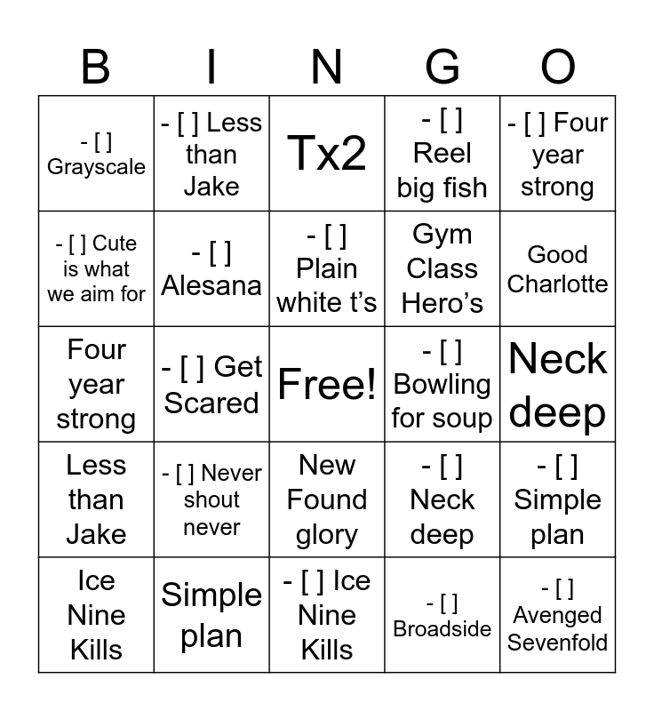 This bingo card has a free space and 46 words: - [ ] Gym Class Hero’s, - [ ] Avenged Sevenfold, - [ ] Good Charlotte, - [ ] Ice Nine Kills, - [ ] Never shout never, - [ ] New Found glory, - [ ] Less than Jake, - [ ] Yellowcard, - [ ] Cute is what we aim for, - [ ] Blink 182, - [ ] Alesana, - [ ] Reel big fish, - [ ] Simple plan, - [ ] Neck deep, - [ ] State champ, - [ ] Glasswaves, - [ ] Plain white t’s, - [ ] Bowling for soup, - [ ] Tx2, - [ ] Four year strong, - [ ] Get Scared, - [ ] Broadside, - [ ] Grayscale, Gym Class Hero’s, Avenged Sevenfold, Good Charlotte, Ice Nine Kills, Never shout never, New Found glory, Less than Jake, Yellowcard, Cute is what we aim for, Blink 182, Alesana, Reel big fish, Simple plan, Neck deep, State champ, Glasswaves, Plain white t’s, Bowling for soup, Tx2, Four year strong, Get Scared, Broadside and Grayscale.