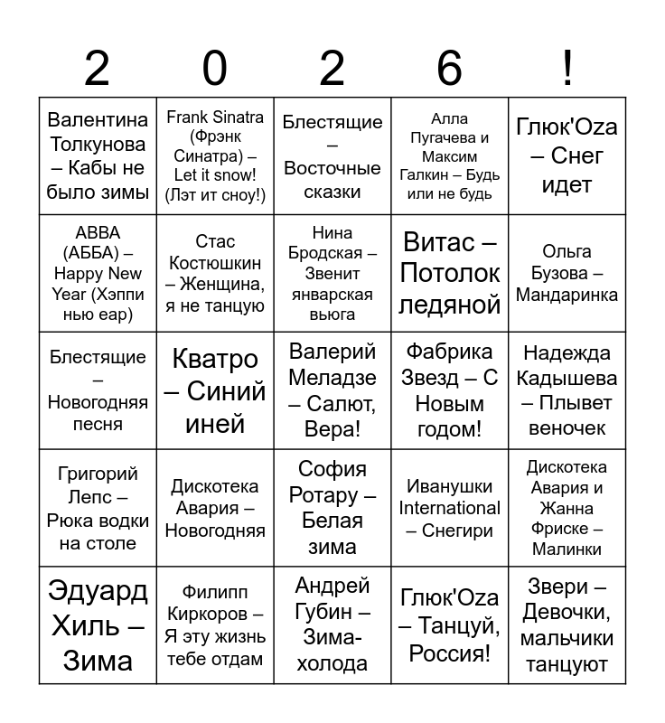This bingo card has 25 words: Дискотека Авария – Новогодняя, Андрей Губин – Зима-холода, Нина Бродская – Звенит январская вьюга, Эдуард Хиль – Зима, Глюк'Oza – Снег идет, Валентина Толкунова – Кабы не было зимы, АВВА (АББА) – Happy New Year (Хэппи нью еар), Frank Sinatra (Фрэнк Синатра) – Let it snow! (Лэт ит сноу!), Фабрика Звезд – С Новым годом!, София Ротару – Белая зима, Витас – Потолок ледяной, Блестящие – Новогодняя песня, Иванушки International – Снегири, Дискотека Авария и Жанна Фриске – Малинки, Стас Костюшкин – Женщина, я не танцую, Звери – Девочки, мальчики танцуют, Надежда Кадышева – Плывет веночек, Блестящие – Восточные сказки, Ольга Бузова – Мандаринка, Кватро – Синий иней, Валерий Меладзе – Салют, Вера!, Филипп Киркоров – Я эту жизнь тебе отдам, Григорий Лепс – Рюка водки на столе, Алла Пугачева и Максим Галкин – Будь или не будь and Глюк'Oza – Танцуй, Россия!.