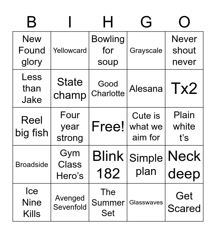 This bingo card has a free space and 24 words: Gym Class Hero’s, Avenged Sevenfold, Good Charlotte, Ice Nine Kills, Never shout never, New Found glory, Less than Jake, Yellowcard, Cute is what we aim for, Blink 182, Alesana, Reel big fish, Simple plan, Neck deep, State champ, Glasswaves, Plain white t’s, Bowling for soup, Tx2, Four year strong, Get Scared, Broadside, Grayscale and The Summer Set.