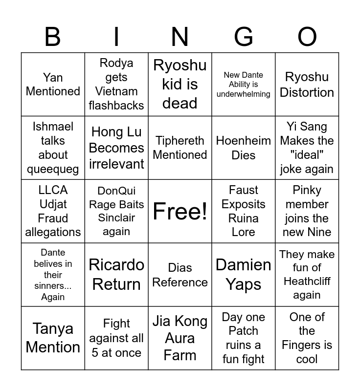 This bingo card has a free space and 25 words: Ricardo Return, Jia Kong Aura Farm, Tiphereth Mentioned, Tanya Mention, Ryoshu Distortion, Yan Mentioned, Ishmael talks about queequeg, Rodya gets Vietnam flashbacks, Faust Exposits Ruina Lore, Dias Reference, Hoenheim Dies, LLCA Udjat Fraud allegations, Damien Yaps, They make fun of Heathcliff again, Hong Lu Becomes irrelevant, Kromer Come Back, Pinky member joins the new Nine, Ryoshu kid is dead, Yi Sang Makes the "ideal" joke again, DonQui Rage Baits Sinclair again, One of the Fingers is cool, Fight against all 5 at once, Dante belives in their sinners... Again, New Dante Ability is underwhelming and Day one Patch ruins a fun fight.