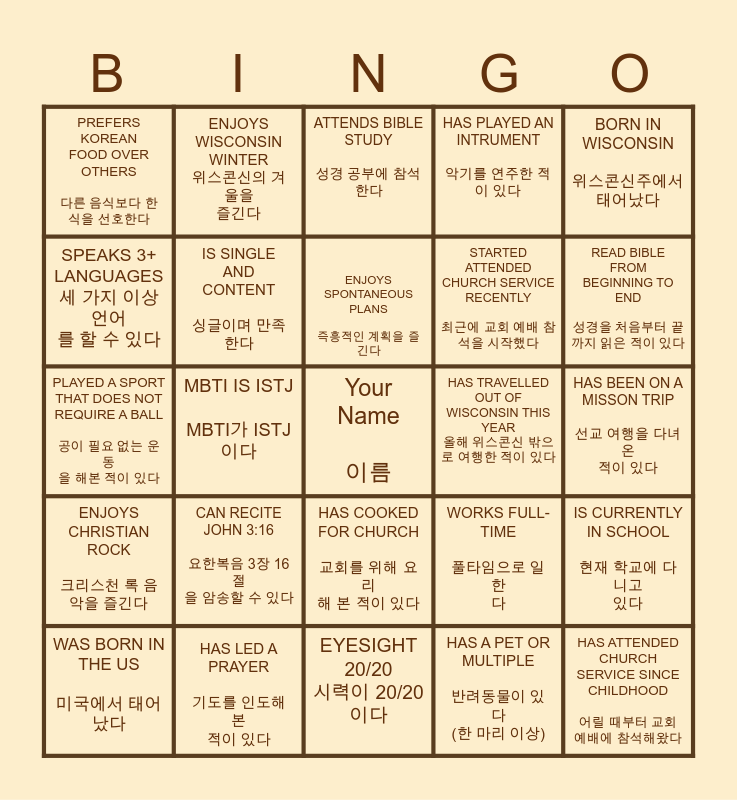 This bingo card has a free space and 27 words: ENJOYS PODCASTS OR AUDIOBOOKS 팟캐스트나 오디오 북을 즐겨 듣는다, HAS LED A PRAYER 기도를 인도해 본 적이 있다, ENJOYS SPONTANEOUS PLANS 즉흥적인 계획을 즐 긴다, HAS A PET OR MULTIPLE 반려동물이 있다 (한 마리 이상), BORN IN WISCONSIN 위스콘신주에서 태어났다, SPEAKS 3+ LANGUAGES 세 가지 이상 언어 를 할 수 있다, ENJOYS WISCONSIN WINTER 위스콘신의 겨울을 즐긴다, EYESIGHT 20/20 시력이 20/20 이다, HAS TRAVELLED OUT OF WISCONSIN THIS YEAR 올해 위스콘신 밖으 로 여행한 적이 있다, IS CURRENTLY IN SCHOOL 현재 학교에 다니고 있다, ENJOYS CHRISTIAN ROCK 크리스천 록 음 악을 즐긴다, IS SINGLE AND CONTENT 싱글이며 만족한다, WORKS FULL- TIME 풀타임으로 일한 다, HAS ATTENDED CHURCH SERVICE SINCE CHILDHOOD 어릴 때부터 교회 예배에 참석해왔다, PLAYED A SPORT THAT DOES NOT REQUIRE A BALL 공이 필요 없는 운동 을 해본 적이 있다, ENJOYS HIKING OR SWIMMING 등산이나 수영을 즐 긴다, ATTENDS BIBLE STUDY 성경 공부에 참석 한다, HAS PLAYED AN INTRUMENT 악기를 연주한 적 이 있다, HAS BEEN ON A MISSON TRIP 선교 여행을 다녀온 적이 있다, PREFERS KOREAN FOOD OVER OTHERS 다른 음식보다 한 식을 선호한다, CAN RECITE JOHN 3:16 요한복음 3장 16절 을 암송할 수 있다, HAS COOKED FOR CHURCH 교회를 위해 요리 해 본 적이 있다, STARTED ATTENDED CHURCH SERVICE RECENTLY 최근에 교회 예배 참 석을 시작했다, READ BIBLE FROM BEGINNING TO END 성경을 처음부터 끝 까지 읽은 적이 있다, WAS BORN IN THE US 미국에서 태어났다, MBTI IS ISTJ MBTI가 ISTJ이다 and CAN PARALLEL PARK 평행 주차를 할 수 있다.