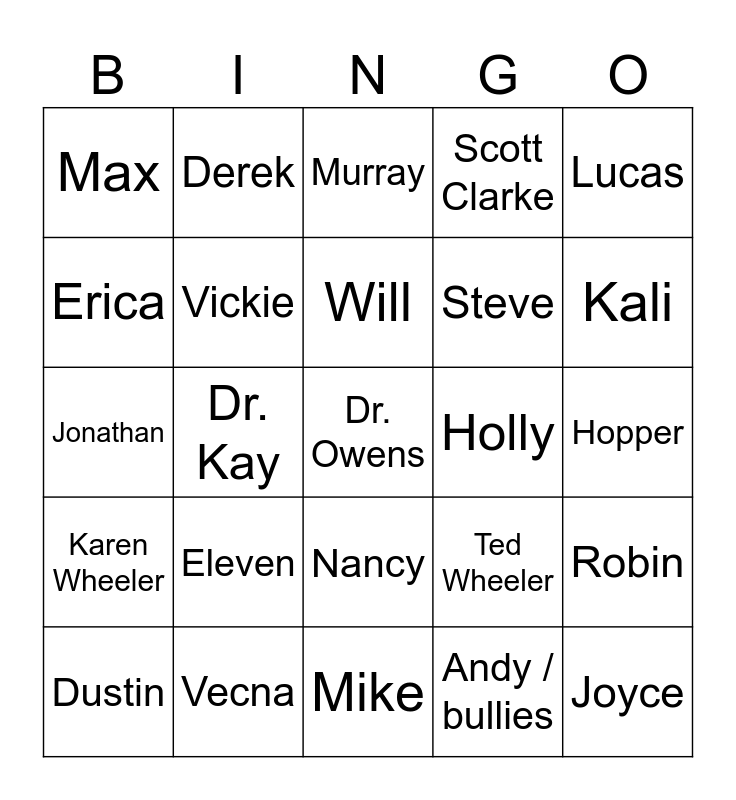This bingo card has 25 words: Eleven, Mike, Will, Dustin, Lucas, Max, Erica, Derek, Holly, Nancy, Steve, Jonathan, Ted Wheeler, Robin, Vickie, Joyce, Hopper, Murray, Kali, Dr. Kay, Dr. Owens, Vecna, Karen Wheeler, Scott Clarke and Andy / bullies.