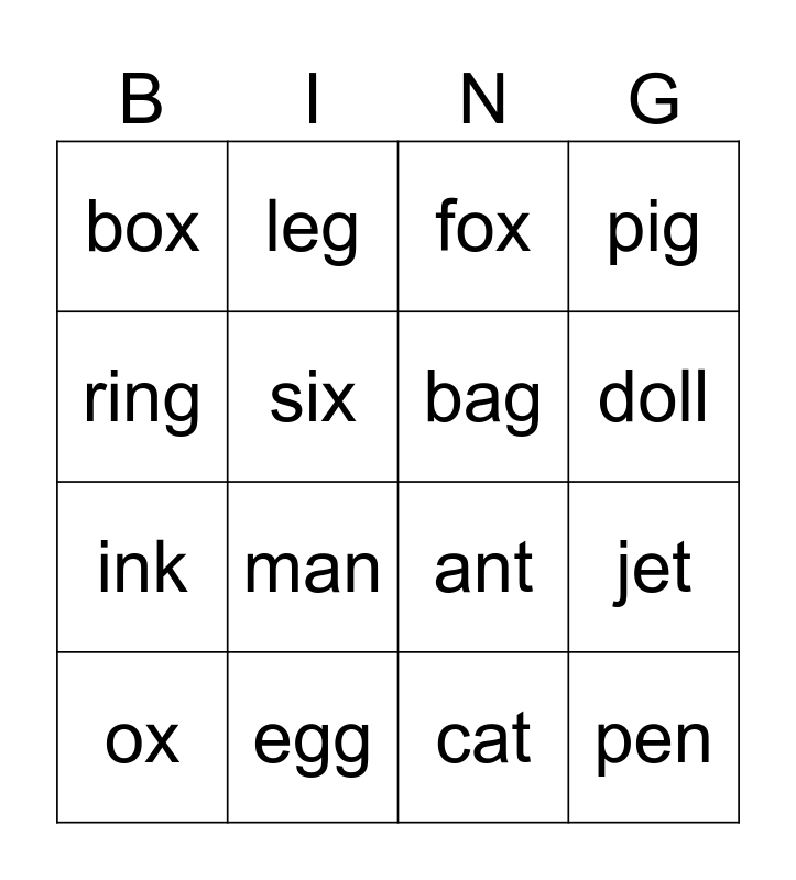 This bingo card has 16 words: egg, jet, fox, box, ink, leg, ant, cat, ring, six, ox, pig, man, doll, bag and pen.