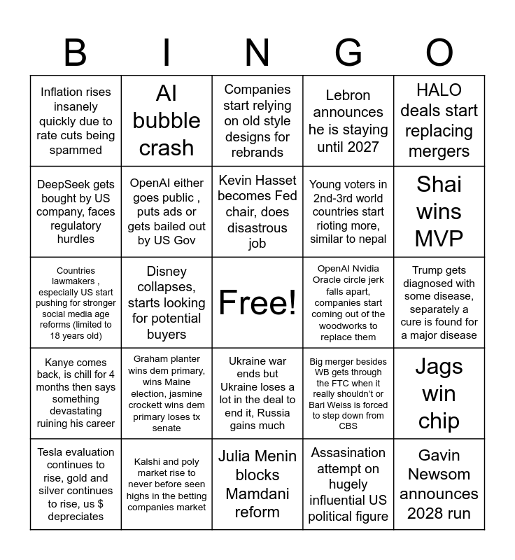 This bingo card has a free space and 24 words: Graham planter wins dem primary, wins Maine election, jasmine crockett wins dem primary loses tx senate, Kalshi and poly market rise to never before seen highs in the betting companies market, Kevin Hasset becomes Fed chair, does disastrous job, Tesla evaluation continues to rise, gold and silver continues to rise, us $ depreciates, HALO deals start replacing mergers, Inflation rises insanely quickly due to rate cuts being spammed, DeepSeek gets bought by US company, faces regulatory hurdles, AI bubble crash, OpenAI Nvidia Oracle circle jerk falls apart, companies start coming out of the woodworks to replace them, Ukraine war ends but Ukraine loses a lot in the deal to end it, Russia gains much, Young voters in 2nd-3rd world countries start rioting more, similar to nepal, Countries lawmakers , especially US start pushing for stronger social media age reforms (limited to 18 years old), Big merger besides WB gets through the FTC when it really shouldn’t or Bari Weiss is forced to step down from CBS, Jags win chip, OpenAI either goes public , puts ads or gets bailed out by US Gov, Assasination attempt on hugely influential US political figure, Trump gets diagnosed with some disease, separately a cure is found for a major disease, Companies start relying on old style designs for rebrands, Shai wins MVP, Disney collapses, starts looking for potential buyers, Gavin Newsom announces 2028 run, Kanye comes back, is chill for 4 months then says something devastating ruining his career, Lebron announces he is staying until 2027 and Julia Menin blocks Mamdani reform.