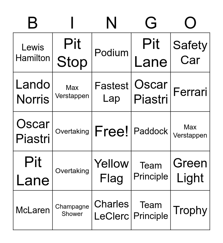 This bingo card has a free space and 56 words: Ferrari, McLaren, Red Bull, Lewis Hamilton, Charles LeClerc, Carlos Sainz, Max Verstappen, Lando Norris, Oscar Piastri, Pit Crew, Pit Lane, Pit Stop, Yellow Flag, Checkered Flag, "Lights Out!", "Box Box Box!", Safety Car, Overtaking, Champagne Shower, Trophy, Paddock, Grandstand, Team Principle, Podium, Grid, Fastest Lap, Green Light, Circuit, Ferrari, McLaren, Red Bull, Lewis Hamilton, Charles LeClerc, Carlos Sainz, Max Verstappen, Lando Norris, Oscar Piastri, Pit Crew, Pit Lane, Pit Stop, Yellow Flag, Checkered Flag, "Lights Out!", "Box Box Box!", Safety Car, Overtaking, Champagne Shower, Trophy, Paddock, Grandstand, Team Principle, Podium, Grid, Fastest Lap, Green Light and Circuit.