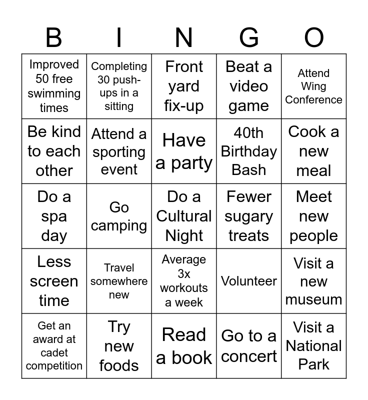 This bingo card has a free space and 24 words: Travel somewhere new, Try new foods, Have a party, Get an award at cadet competition, Attend Wing Conference, Improved 50 free swimming times, Be kind to each other, Completing 30 push-ups in a sitting, Fewer sugary treats, Average 3x workouts a week, 40th Birthday Bash, Do a spa day, Volunteer, Visit a new museum, Attend a sporting event, Go to a concert, Meet new people, Front yard fix-up, Cook a new meal, Go camping, Visit a National Park, Less screen time, Beat a video game and Read a book.