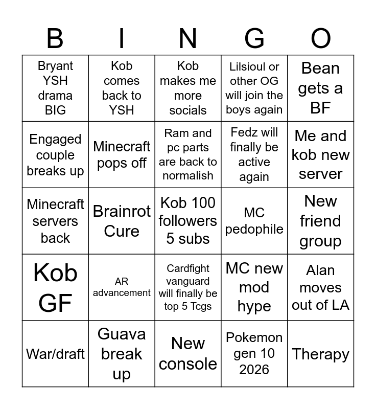 This bingo card has 25 words: Kob GF, Guava break up, Kob 100 followers 5 subs, Pokemon gen 10 2026, Bean gets a BF, Bryant YSH drama BIG, Kob comes back to YSH, Kob makes me more socials, MC pedophile, Alan moves out of LA, Engaged couple breaks up, Minecraft pops off, New console, MC new mod hype, Me and kob new server, War/draft, Brainrot Cure, Ram and pc parts are back to normalish, Fedz will finally be active again, New friend group, Minecraft servers back, AR advancement, Cardfight vanguard will finally be top 5 Tcgs, Lilsioul or other OG will join the boys again and Therapy.