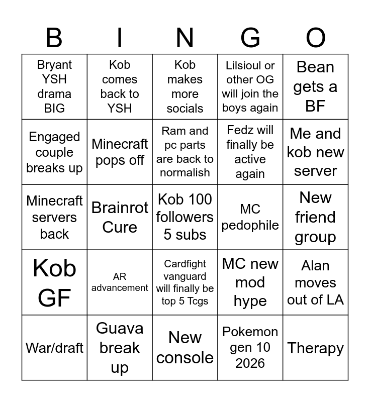 This bingo card has 25 words: Kob GF, Guava break up, Kob 100 followers 5 subs, Pokemon gen 10 2026, Bean gets a BF, Bryant YSH drama BIG, Kob comes back to YSH, Kob makes more socials, MC pedophile, Alan moves out of LA, Engaged couple breaks up, Minecraft pops off, New console, MC new mod hype, Me and kob new server, War/draft, Brainrot Cure, Ram and pc parts are back to normalish, Fedz will finally be active again, New friend group, Minecraft servers back, AR advancement, Cardfight vanguard will finally be top 5 Tcgs, Lilsioul or other OG will join the boys again and Therapy.