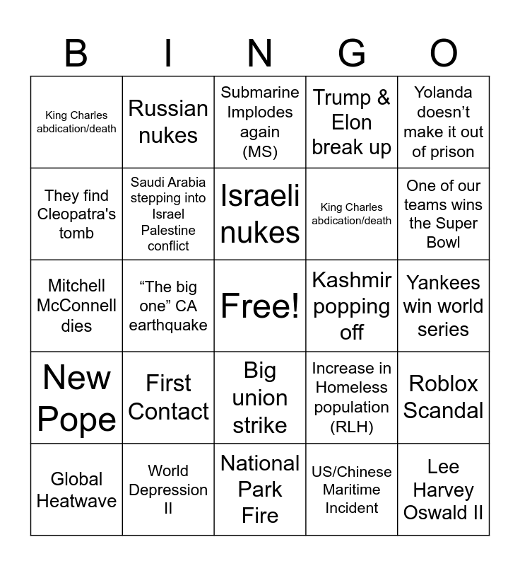 This bingo card has a free space and 24 words: First Contact, World Depression II, Israeli nukes, Global Heatwave, Yolanda doesn’t make it out of prison, King Charles abdication/death, They find Cleopatra's tomb, Russian nukes, Kashmir popping off, Big union strike, King Charles abdication/death, Mitchell McConnell dies, Increase in Homeless population (RLH), Roblox Scandal, Saudi Arabia stepping into Israel Palestine conflict, US/Chinese Maritime Incident, Yankees win world series, Submarine Implodes again (MS), One of our teams wins the Super Bowl, “The big one” CA earthquake, Lee Harvey Oswald II, New Pope, Trump & Elon break up and National Park Fire.