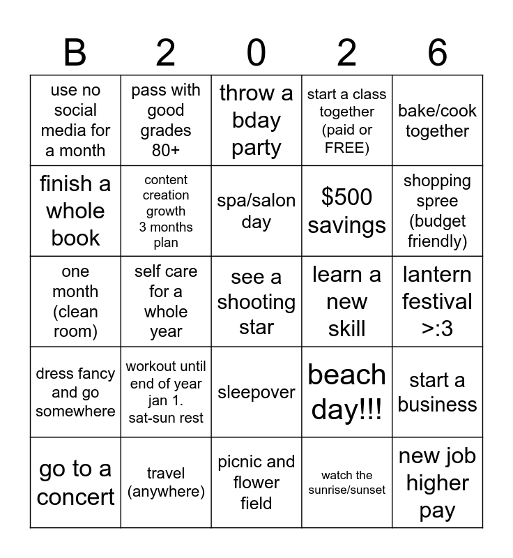 This bingo card has a free space and 24 words: workout until end of year jan 1. sat-sun rest, travel (anywhere), spa/salon day, go to a concert, bake/cook together, use no social media for a month, finish a whole book, pass with good grades 80+, learn a new skill, sleepover, $500 savings, one month (clean room), beach day!!!, start a business, content creation growth 3 months plan, watch the sunrise/sunset, lantern festival >:3, throw a bday party, shopping spree (budget friendly), self care for a whole year, new job higher pay, dress fancy and go somewhere, start a class together (paid or FREE) and picnic and flower field.