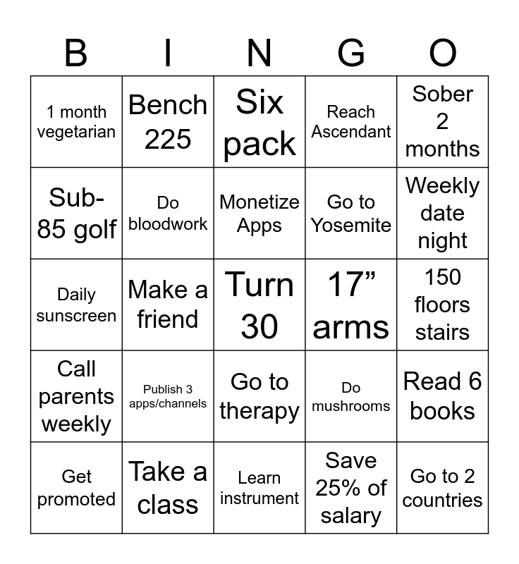 This bingo card has a free space and 24 words: Get promoted, Publish 3 apps/channels, Monetize Apps, Save 100k, Sober 2 months, 1 month vegetarian, Bench 225, Six pack, 17” arms, 150 floors stairs, Daily sunscreen, Do bloodwork, Do mushrooms, Read 6 books, Sub-85 golf, Take a class, Learn instrument, Reach Ascendant, Weekly date night, Call parents weekly, Make a friend, Go to therapy, Go to Yosemite and Go to 2 countries.