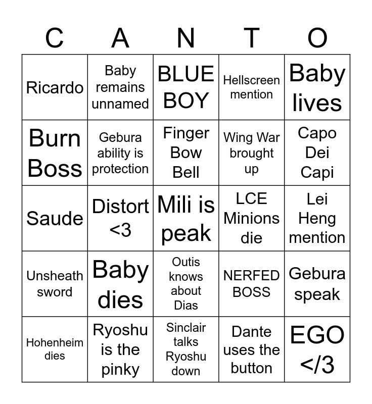 This bingo card has a free space and 24 words: Baby dies, Ryoshu is the pinky, Finger Bow Bell, Hohenheim dies, Baby lives, Ricardo, Burn Boss, Baby remains unnamed, LCE Minions die, Outis knows about Dias, Wing War brought up, Saude, NERFED BOSS, Gebura speak, Gebura ability is protection, Dante uses the button, Lei Heng mention, BLUE BOY, Capo Dei Capi, Distort <3, EGO </3, Unsheath sword, Hellscreen mention and Sinclair talks Ryoshu down.