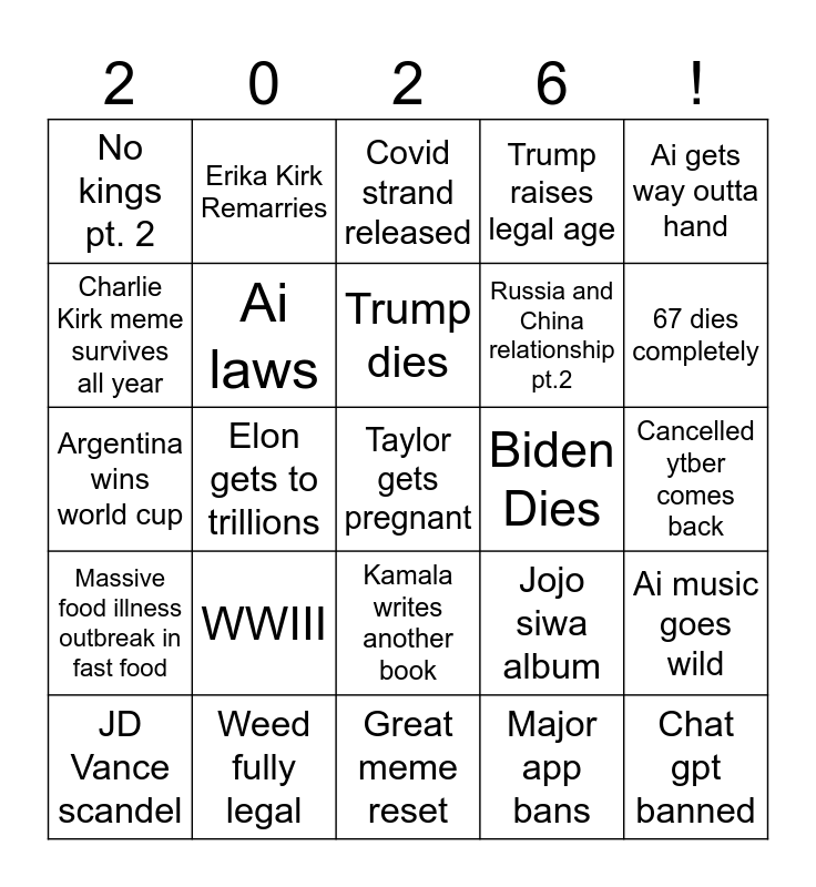 This bingo card has a free space and 24 words: WWIII, Weed fully legal, Trump dies, JD Vance scandel, Ai gets way outta hand, No kings pt. 2, Charlie Kirk meme survives all year, Erika Kirk Remarries, Biden Dies, Kamala writes another book, Russia and China relationship pt.2, Argentina wins world cup, Jojo siwa album, Ai music goes wild, Ai laws, Major app bans, Cancelled ytber comes back, Covid strand released, 67 dies completely, Elon gets to trillions, Chat gpt banned, Massive food illness outbreak in fast food, Trump raises legal age and Great meme reset.