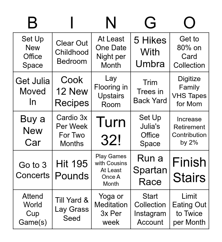 This bingo card has a free space and 24 words: Hit 195 Pounds, Till Yard & Lay Grass Seed, Lay Flooring in Upstairs Room, Attend World Cup Game(s), Get to 80% on Card Collection, Set Up New Office Space, Get Julia Moved In, Clear Out Childhood Bedroom, Set Up Julia's Office Space, Play Games with Cousins At Least Once A Month, Trim Trees in Back Yard, Buy a New Car, Run a Spartan Race, Finish Stairs, Cook 12 New Recipes, Start Collection Instagram Account, Increase Retirement Contribution by 2%, At Least One Date Night per Month, Digitize Family VHS Tapes for Mom, Cardio 3x Per Week For Two Months, Limit Eating Out to Twice per Month, Go to 3 Concerts, 5 Hikes With Umbra and Yoga or Meditation 3x Per week.