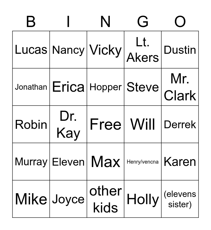 This bingo card has a free space and 24 words: Eleven, Joyce, Hopper, Mike, Dustin, Lucas, Jonathan, Nancy, Will, Max, Steve, Robin, Henry/vencna, Karen, Erica, Holly, Derrek, Vicky, Mr. Clark, Dr. Kay, (elevens sister), Murray, Lt. Akers and other kids.