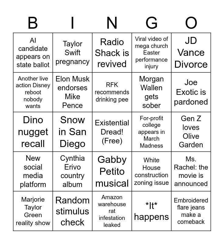 This bingo card has a free space and 24 words: Cynthia Erivo country album, Random stimulus check, RFK recommends drinking pee, Marjorie Taylor Green reality show, JD Vance Divorce, AI candidate appears on state ballot, Another live action Disney reboot nobody wants, Taylor Swift pregnancy, For-profit college appears in March Madness, Gabby Petito musical, Morgan Wallen gets sober, Dino nugget recall, White House construction zoning issue, Ms. Rachel: the movie is announced, Elon Musk endorses Mike Pence, *It* happens, Gen Z loves Olive Garden, Radio Shack is revived, Joe Exotic is pardoned, Snow in San Diego, Embroidered flare jeans make a comeback, New social media platform, Viral video of mega church Easter performance injury and Amazon warehouse rat infestation leaked.