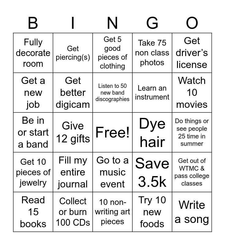 This bingo card has a free space and 24 words: Fill my entire journal, Collect or burn 100 CDs, Listen to 50 new band discographies, Read 15 books, Get driver’s license, Fully decorate room, Get a new job, Get piercing(s), Dye hair, Go to a music event, Learn an instrument, Be in or start a band, Save 3.5k, Get out of WTMC & pass college classes, Get better digicam, Try 10 new foods, Do things or see people 25 time in summer, Get 5 good pieces of clothing, Watch 10 movies, Give 12 gifts, Write a song, Get 10 pieces of jewelry, Take 75 non class photos and 10 non-writing art pieces.