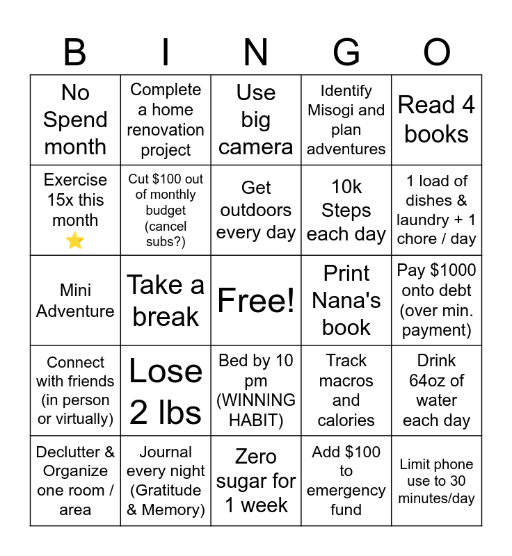This bingo card has a free space and 24 words: Lose 2 lbs, Journal every night (Gratitude & Memory), Get outdoors every day, Declutter & Organize one room / area, Read 4 books, No Spend month, Exercise 15x this month ⭐, Complete a home renovation project, Print Nana's book, Bed by 10 pm (WINNING HABIT), 10k Steps each day, Mini Adventure, Track macros and calories, Drink 64oz of water each day, Cut $100 out of monthly budget (cancel subs?), Add $100 to emergency fund, Pay $1000 onto debt (over min. payment), Use big camera, 1 load of dishes & laundry + 1 chore / day, Take a break, Limit phone use to 30 minutes/day, Connect with friends (in person or virtually), Identify Misogi and plan adventures and Zero sugar for 1 week.