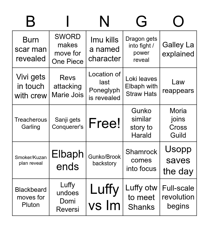 This bingo card has a free space and 24 words: Elbaph ends, Luffy undoes Domi Reversi, Location of last Poneglyph is revealed, Blackbeard moves for Pluton, Galley La explained, Burn scar man revealed, Vivi gets in touch with crew, SWORD makes move for One Piece, Gunko similar story to Harald, Gunko/Brook backstory, Loki leaves Elbaph with Straw Hats, Treacherous Garling, Shamrock comes into focus, Usopp saves the day, Revs attacking Marie Jois, Luffy otw to meet Shanks, Moria joins Cross Guild, Imu kills a named character, Law reappears, Sanji gets Conquerer's, Full-scale revolution begins, Smoker/Kuzan plan reveal, Dragon gets into fight / power reveal and Luffy vs Im.
