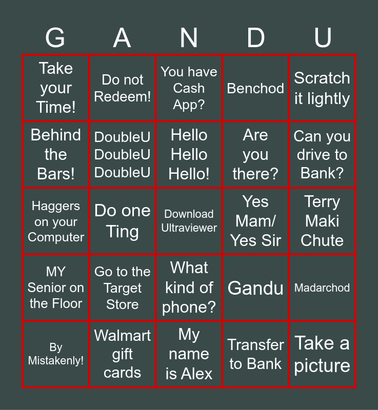 This bingo card has 50 words: I will lose my Job!, Download Ultraviewer, Windows Key, My name is Alex, Go to the Target Store, On this recorded line, Do not Redeem!, Have you gone Mad?, Behind the Bars!, for medical reasons, DoubleU DoubleU DoubleU, Benchod, Madarchod, Gandu, You have to return our Money, Speak to a Manager, Hello Hello Hello!, Yes Mam/ Yes Sir, Google Play Gift Card, Scratch it lightly, Do one Ting, Transfer to Bank, Take your Time!, Are you there?, Read me the numbers!, Take a picture, Can you drive to Bank?, How far is your Bank?, You have Cash App?, What kind of phone?, Open Google Chrome, Are you joking with me?, Are you dressed?, Level 9 technician, Walmart gift cards, Each and Everything, Log into your bank, I knew from the Bigginin, It's the Robotic server, Terry Maki Chute, Lifetime Package, You in front of Computer?, Are you playing with Me?, I will give you the Code, By Mistakenly!, Haggers on your Computer, Just leave your Mouse, Remodel your House, MY Senior on the Floor and Goat House.