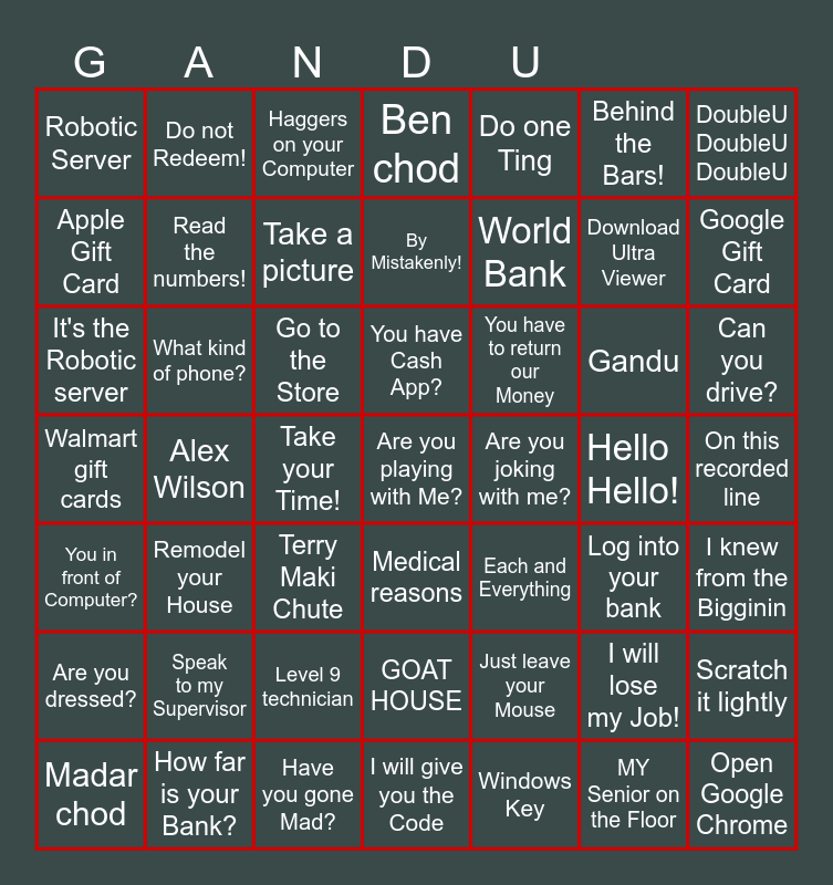 This bingo card has 49 words: I will lose my Job!, Download Ultra Viewer, Windows Key, Alex Wilson, Go to the Store, On this recorded line, Do not Redeem!, Have you gone Mad?, Behind the Bars!, Medical reasons, DoubleU DoubleU DoubleU, Ben chod, Gandu, You have to return our Money, Speak to my Supervisor, Hello Hello!, Apple Gift Card, Google Gift Card, Scratch it lightly, Do one Ting, World Bank, Take your Time!, Robotic Server, Read the numbers!, Madar chod, Take a picture, Can you drive?, How far is your Bank?, You have Cash App?, What kind of phone?, Open Google Chrome, Are you joking with me?, Are you dressed?, Level 9 technician, Walmart gift cards, Each and Everything, Log into your bank, I knew from the Bigginin, It's the Robotic server, Terry Maki Chute, GOAT HOUSE, You in front of Computer?, Are you playing with Me?, I will give you the Code, By Mistakenly!, Haggers on your Computer, Just leave your Mouse, Remodel your House and MY Senior on the Floor.
