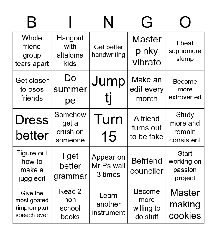 This bingo card has a free space and 24 words: I get better grammar, Read 2 non school books, Jump tj, Give the most goated (impromptu) speech ever, I beat sophomore slump, Whole friend group tears apart, Get closer to osos friends, Hangout with altaloma kids, A friend turns out to be fake, Appear on Mr Ps wall 3 times, Make an edit every month, Dress better, Befriend councilor, Start working on passion project, Do summer pe, Become more willing to do stuff, Study more and remain consistent, Get better handwriting, Become more extroverted, Somehow get a crush on someone, Master making cookies, Figure out how to make a jugg edit, Master pinky vibrato and Learn another instrument.