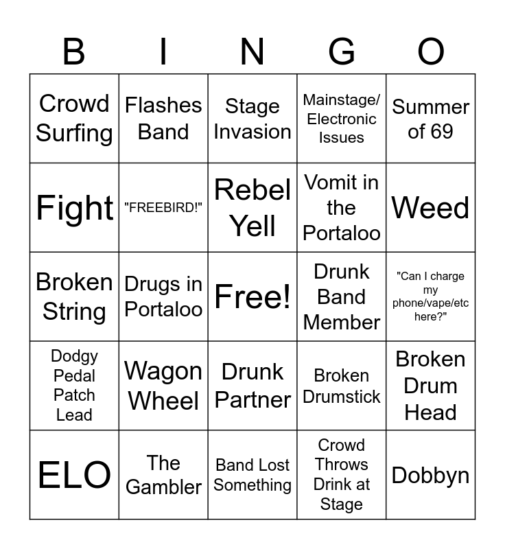 This bingo card has a free space and 24 words: Wagon Wheel, The Gambler, Rebel Yell, ELO, Summer of 69, Crowd Surfing, Fight, Flashes Band, Drunk Band Member, Drunk Partner, Vomit in the Portaloo, Broken String, Broken Drumstick, Broken Drum Head, "FREEBIRD!", Crowd Throws Drink at Stage, "Can I charge my phone/vape/etc here?", Stage Invasion, Weed, Drugs in Portaloo, Dobbyn, Dodgy Pedal Patch Lead, Mainstage/ Electronic Issues and Band Lost Something.