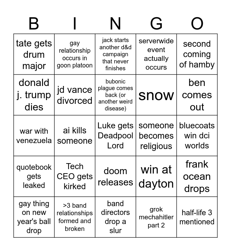 This bingo card has a free space and 24 words: Tech CEO gets kirked, >3 band relationships formed and broken, bubonic plague comes back (or another weird disease), gay thing on new year's ball drop, second coming of hamby, tate gets drum major, donald j. trump dies, gay relationship occurs in goon platoon, someone becomes religious, doom releases, snow, war with venezuela, win at dayton, frank ocean drops, jd vance divorced, grok mechahitler part 2, bluecoats win dci worlds, jack starts another d&d campaign that never finishes, ben comes out, ai kills someone, half-life 3 mentioned, quotebook gets leaked, serverwide event actually occurs and band directors drop a slur.