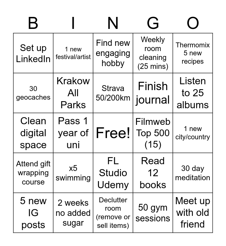 This bingo card has a free space and 24 words: x5 swimming, 2 weeks no added sugar, Strava 50/200km, 5 new IG posts, Thermomix 5 new recipes, Set up LinkedIn, 30 geocaches, 1 new festival/artist, Filmweb Top 500 (15), FL Studio Udemy, Finish journal, Clean digital space, Read 12 books, 30 day meditation, Krakow All Parks, 50 gym sessions, 1 new city/country, Find new engaging hobby, Listen to 25 albums, Pass 1 year of uni, Meet up with old friend, Attend gift wrapping course, Weekly room cleaning (25 mins) and Declutter room (remove or sell items).