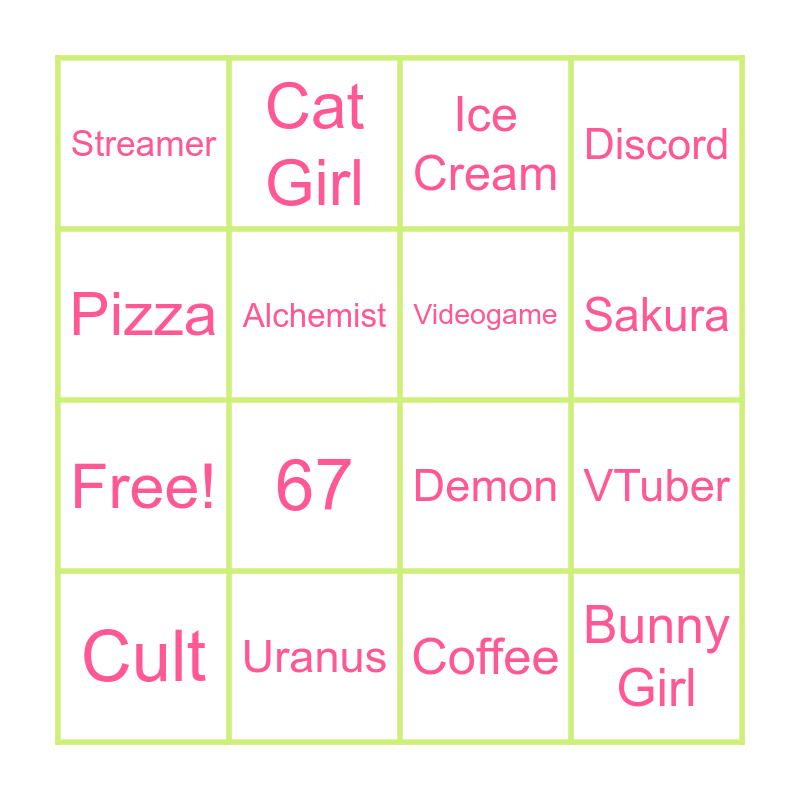 This bingo card has 20 words: VTuber, Anime, Ice Cream, Jackalope, Cult, Pizza, Uranus, Streamer, Free!, Cat Girl, 67, Demon, Alchemist, Bunny Girl, Videogame, Hatsune Miku, Sakura, Discord, Coffee and Dog Girl.