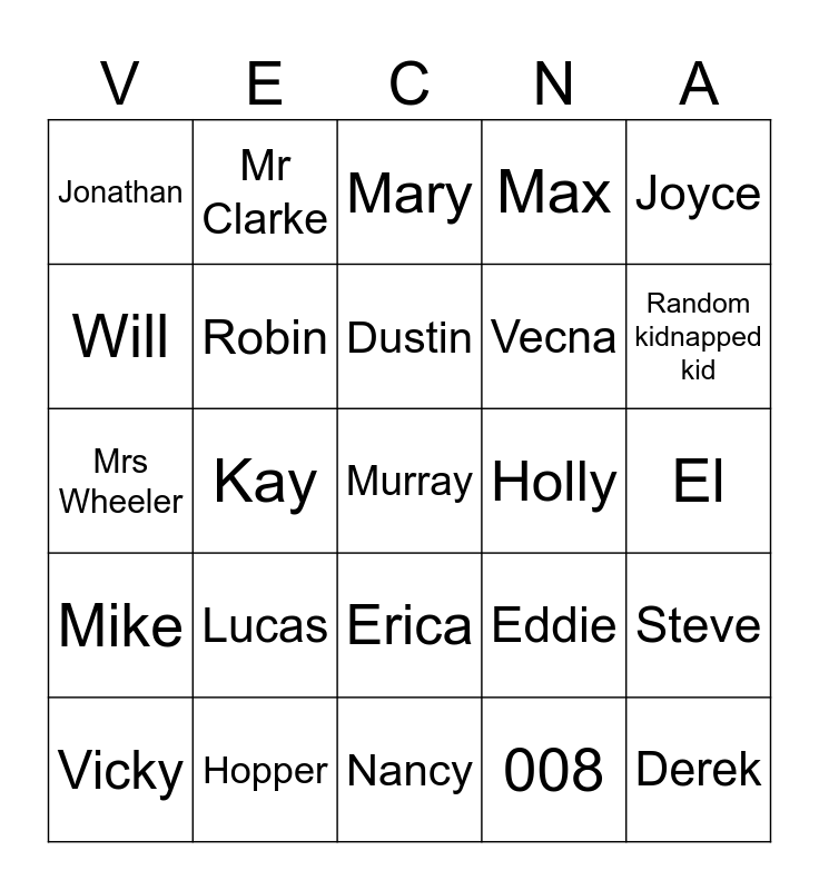 This bingo card has 25 words: Lucas, Nancy, Dustin, Vicky, Joyce, Jonathan, Will, Mr Clarke, Holly, Erica, Vecna, Mrs Wheeler, Eddie, Steve, Robin, Derek, El, Mary, Random kidnapped kid, Kay, Murray, Hopper, Mike, Max and 008.