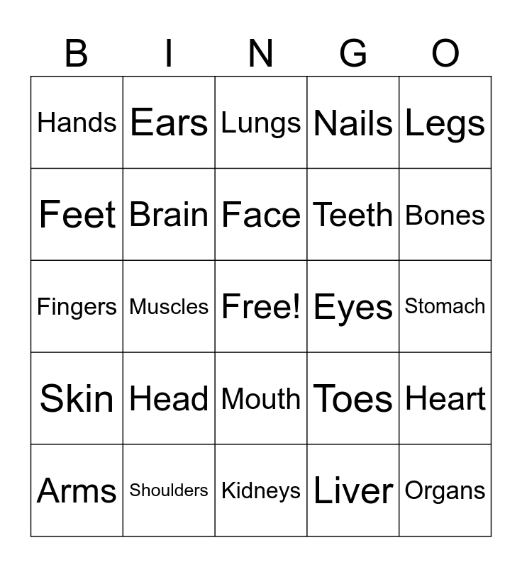This bingo card has a free space and 24 words: Head, Shoulders, Face, Arms, Legs, Hands, Feet, Ears, Eyes, Mouth, Teeth, Fingers, Toes, Heart, Brain, Liver, Stomach, Lungs, Bones, Muscles, Organs, Skin, Nails and Kidneys.