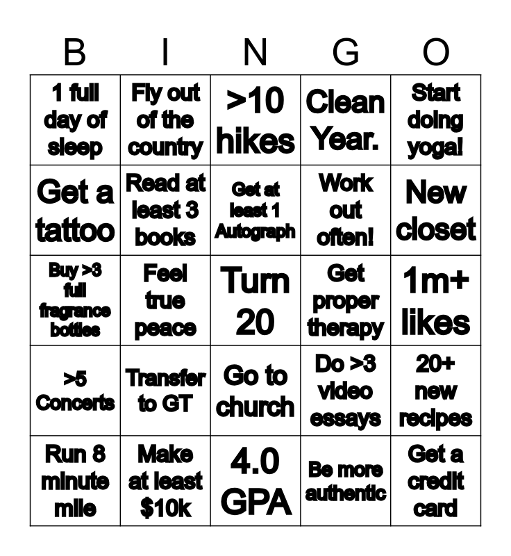 This bingo card has a free space and 24 words: Transfer to GT, Make at least $10k, Get at least 1 Autograph, Run 8 minute mile, Start doing yoga!, 1 full day of sleep, Get a tattoo, Fly out of the country, Get proper therapy, Go to church, Work out often!, Buy >3 full fragrance bottles, Do >3 video essays, 20+ new recipes, Read at least 3 books, Be more authentic, 1m+ likes, >10 hikes, New closet, Feel true peace, Get a credit card, >5 Concerts, Clean Year. and 4.0 GPA.
