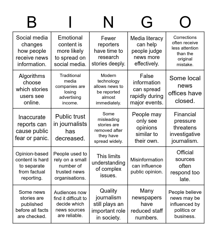 This bingo card has a free space and 24 words: People used to rely on a small number of trusted news organisations., Audiences now find it difficult to decide which news sources are reliable., Modern technology allows news to be reported almost immediately., Some news stories are published before all facts are checked., Corrections often receive less attention than the original mistake., Social media changes how people receive news information., Algorithms choose which stories users see online., Emotional content is more likely to spread on social media., People may only see opinions similar to their own., This limits understanding of complex issues., False information can spread rapidly during major events., Inaccurate reports can cause public fear or panic., Misinformation can influence public opinion., Official sources often respond too late., Traditional media companies are losing advertising income., Many newspapers have reduced staff numbers., Financial pressure threatens investigative journalism., Fewer reporters have time to research stories deeply., Some local news offices have closed., Public trust in journalists has decreased., People believe news may be influenced by politics or business., Opinion-based content is hard to separate from factual reporting., Media literacy can help people judge news more effectively. and Quality journalism still plays an important role in society..