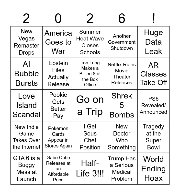 This bingo card has a free space and 24 words: Pokémon Cards Appear in Stores Again, Gabe Cube Releases at an Affordable Price, Iron Lung Makes a Billion $ at the Box Office, GTA 6 is a Buggy Mess at Launch, Huge Data Leak, New Vegas Remaster Drops, AI Bubble Bursts, America Goes to War, Shrek 5 Bombs, I Get Sous Chef Position, Netflix Ruins Movie Theater Releases, Love Island Scandal, New Doctor Who Something, Tragedy at the Super Bowl, Epstein Files Actually Release, Trump Has a Serious Medical Problem, PS6 Revealed/ Announced, Summer Heat Wave Closes Schools, AR Glasses Take Off, Pookie Gets Better Pay, World Ending Hoax, New Indie Game Takes Over the Internet, Another Government Shutdown and Half-Life 3!!!.