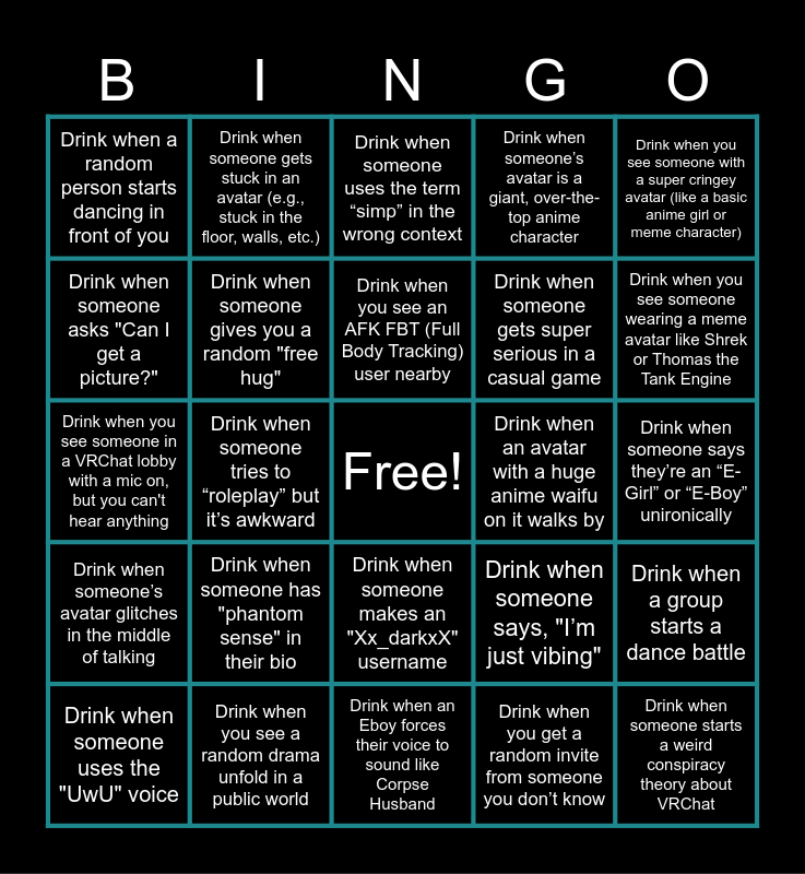 This bingo card has a free space and 25 words: Drink when someone has "phantom sense" in their bio, Drink when an Eboy forces their voice to sound like Corpse Husband, Drink when you see an AFK FBT (Full Body Tracking) user nearby, Drink when someone uses the "UwU" voice, Drink when you see someone with a super cringey avatar (like a basic anime girl or meme character), Drink when a random person starts dancing in front of you, Drink when someone asks "Can I get a picture?", Drink when someone gets stuck in an avatar (e.g., stuck in the floor, walls, etc.), Drink when an avatar with a huge anime waifu on it walks by, Drink when someone makes an "Xx_darkxX" username, Drink when someone gets super serious in a casual game, Drink when you see someone in a VRChat lobby with a mic on, but you can't hear anything, Drink when someone says, "I’m just vibing", Drink when a group starts a dance battle, Drink when someone gives you a random "free hug", Drink when you hear the "VRChat loading" sound, Drink when someone says they’re an “E-Girl” or “E-Boy” unironically, Drink when someone uses the term “simp” in the wrong context, Drink when you see someone wearing a meme avatar like Shrek or Thomas the Tank Engine, Drink when someone tries to “roleplay” but it’s awkward, Drink when someone starts a weird conspiracy theory about VRChat, Drink when you see a random drama unfold in a public world, Drink when someone’s avatar glitches in the middle of talking, Drink when someone’s avatar is a giant, over-the-top anime character and Drink when you get a random invite from someone you don’t know.