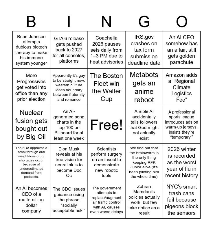 This bingo card has a free space and 25 words: Elon Musk reveals at his true vision for neuralink is to become Doc Oc, The government attempts to replace/augment air traffic control with AI, causes even worse delays, The Boston Fleet win the Walter Cup, An AI becomes CEO of a multi-million dollar company, An AI CEO somehow has an affair, still gets golden parachute, Brian Johnson attempts dubious biotech therapy to make his immune system younger, More Progressives get voted into office than any prior election, GTA 6 release gets pushed back to 2027 for all consoles, platforms, A Bible AI accidentally tells followers that God might not actually exist, Scientists perform surgery on an insect to demonstrate new robotic tools, Metabots gets an anime reboot, Nuclear fusion gets bought out by Big Oil, We find out that the brainworm is the only thing keeping RFK Junior alive (it's been piloting him the whole time), 2026 winter is recorded as the worst year of flu in recent history, Apparently it's gay to be straight now; western culture loses boundary between fraternity and romance, Nvidia buys stakes in more chip fab companies, circle jerk intensifies, A professional sports league introduces ads on warm-up jerseys, insists they’re “temporary.”, Coachella 2026 pauses sets daily from 1–3 PM due to heat advisories, Amazon adds a “Regional Climate Logistics Fee”, An AI-generated song charts in the top 100 on Billboard for at least one week, NYC's smart trash cans fail because pigeons block the sensors, The CDC issues guidance using the phrase “socially acceptable risk.”, The FDA approves a breakthrough oral weight-loss drug, shortages occur because of underestimated demand from podcasts., IRS.gov crashes on tax form submission deadline date and Zohran Mamdani's policies actually work, but few take notice as a result.